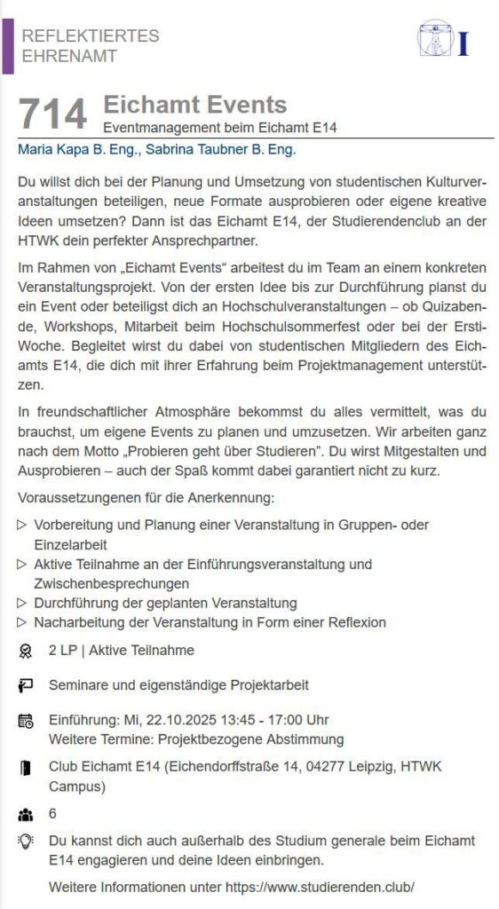 Im Rahmen von „Eichamt Events“ arbeitest du im Team an einem konkreten Veranstaltungsprojekt. Von der ersten Idee bis zur Durchführung planst du ein Event oder beteiligst dich an Hochschulveranstaltungen – ob Quizabende, Workshops, Mitarbeit beim Hochschulsommerfest oder bei der Ersti-Woche. Begleitet wirst du dabei von studentischen Mitgliedern des Eichamts E14, die dich mit ihrer Erfahrung beim Projektmanagement unterstützen.